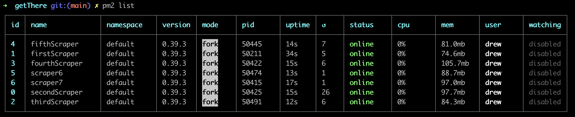 pm2 start --no-autorestart --name "$source->$destination" node -- src/scraper/scraper.js --from "SFO" --to "JFK" --date "2023-11-07"Viewing Processes